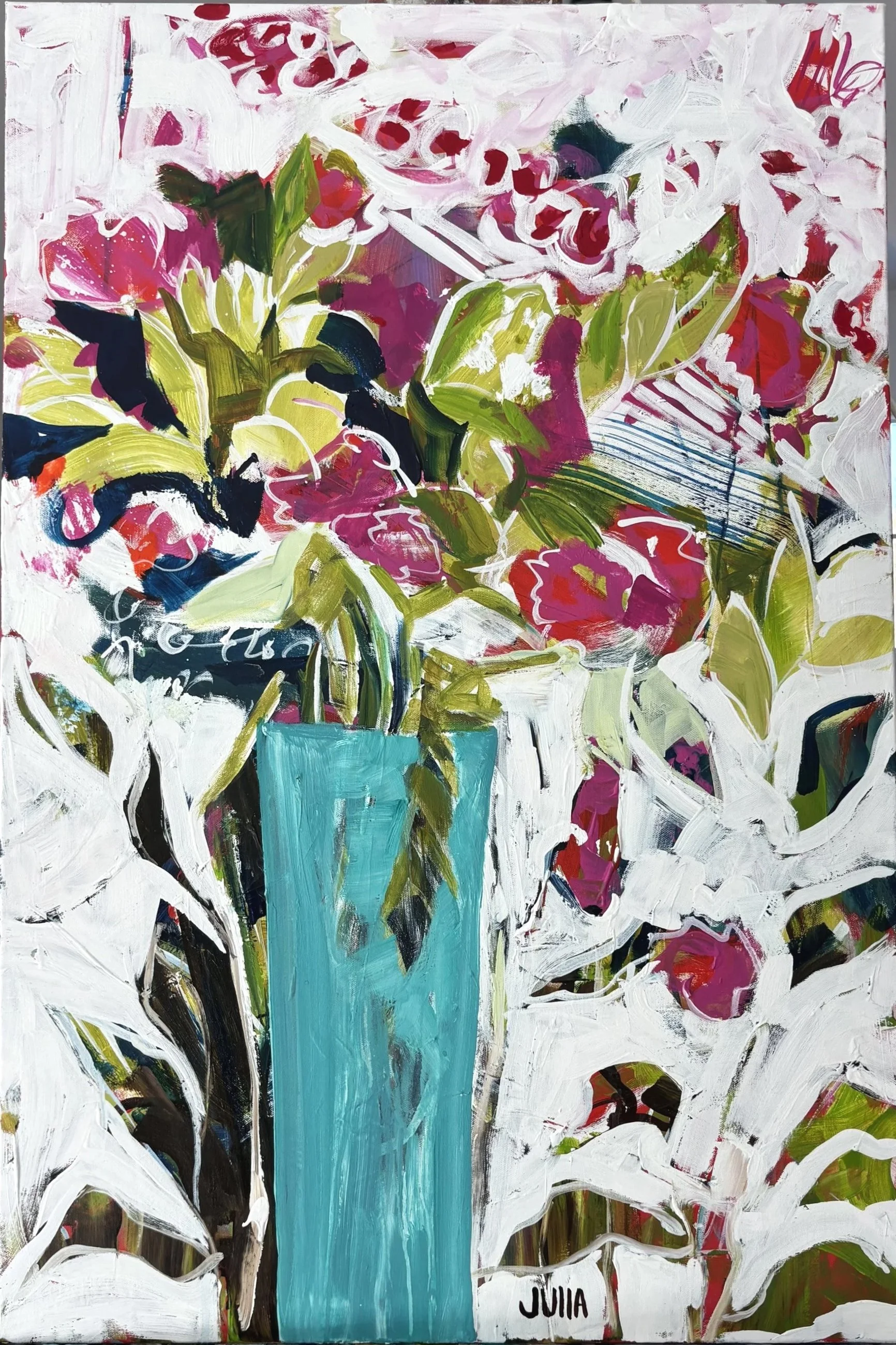 TEAL VASE WITH RED HOTS 24x36